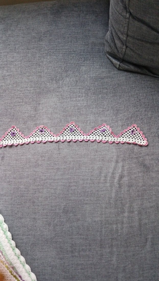 Pembe kenar işlemeli, geleneksel üçgen desenli el yapımı dantel şerit. Tekstillere zarif bir dokunuş katar.