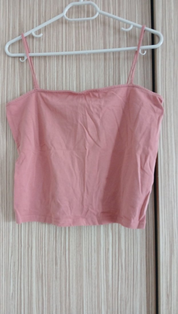 Pembe keten kumaştan, ince askılı ve straplez yaka detaylı, günlük kullanıma uygun sade ve şık kadın atlet.