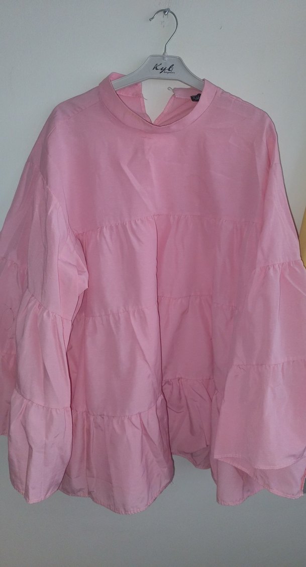 Pembe keten kumaştan, bol kesim, uzun kollu ve yüksek yakalı bluz, fırfır detaylı. Günlük kullanım için uygun, trend rahat stil sunar. ufacık bir lekesi var o kadar
