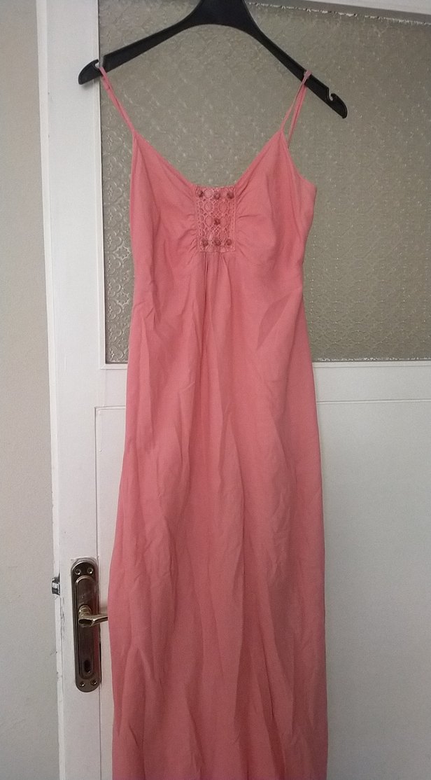 Pembe keten kumaştan yapılmış bol kesim uzun elbise. pembe ile turuncu arası güzel tatlı bir renk yazlık elbise askılı 36 ve 38 beden uyumlu üstü dar altı bol uzun yazlık keten elbise kusursuzdur