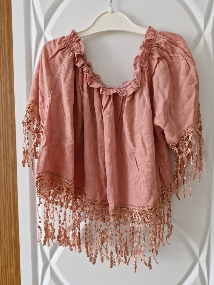 Pembe keten kumaştan, kısa kollu ve salaş kesim bohem tarz bluz. İşlemeli detaylar, fırfırlı ve püsküllü kenarlarıyla günlük kullanıma uygun.