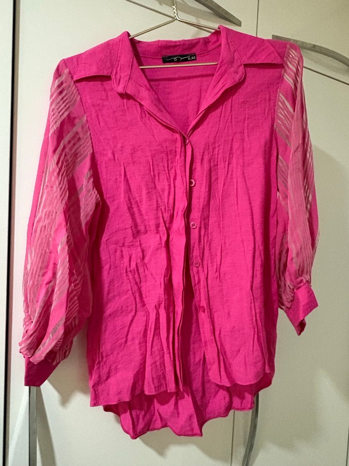 Düğmeli, uzun kollu, V yakalı pembe keten gömlek. Kolları şeffaf çizgili detaylı, bol kesim bohem tarz. Günlük kullanım için uygun. Hiç bir sorunu yok. Boy önden 60 cm arkadan 70 cm