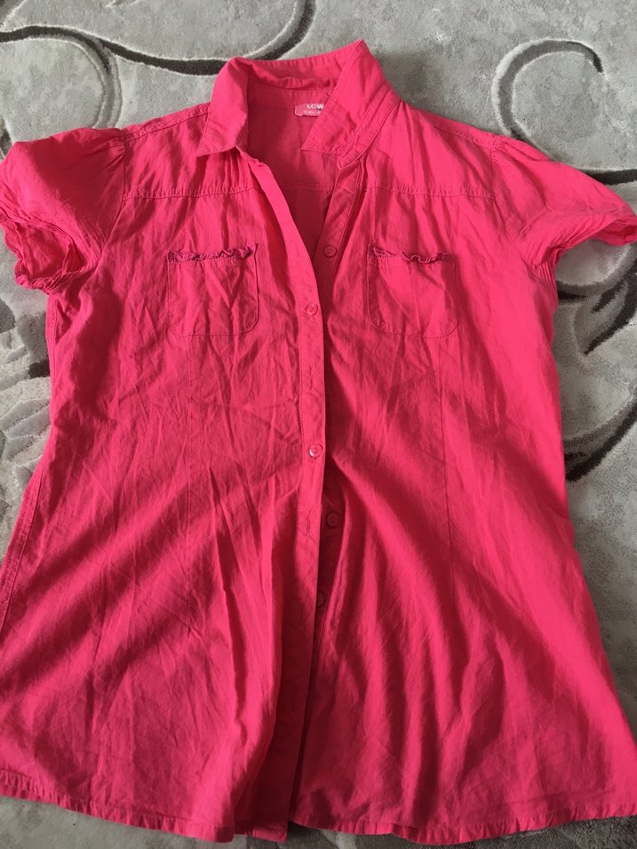 Pembe keten kumaştan, kısa kollu, düğmeli ve yakalı, bol kesim kadın gömlek. Günlük kullanıma uygun.