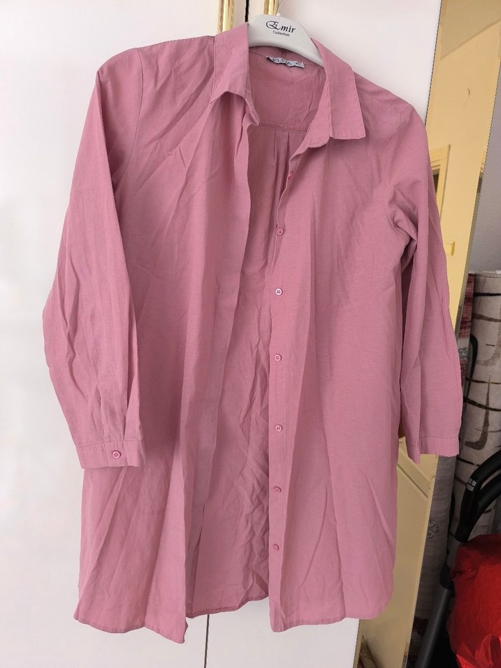Pembe keten gömlek, uzun kollu ve yakalıdır. Düğmeli ve midi boyda, rahat kesimiyle günlük kullanıma uygundur.