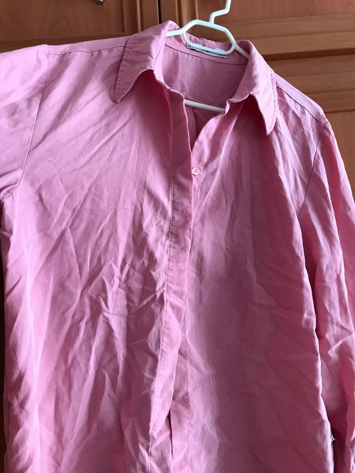 Pastel pembe renkte keten kumaştan, düğmeli, yakalı, uzun kollu ve bol kesim kadın gömlek. Normal midi boyda, günlük kullanıma uygun sade tarzda.