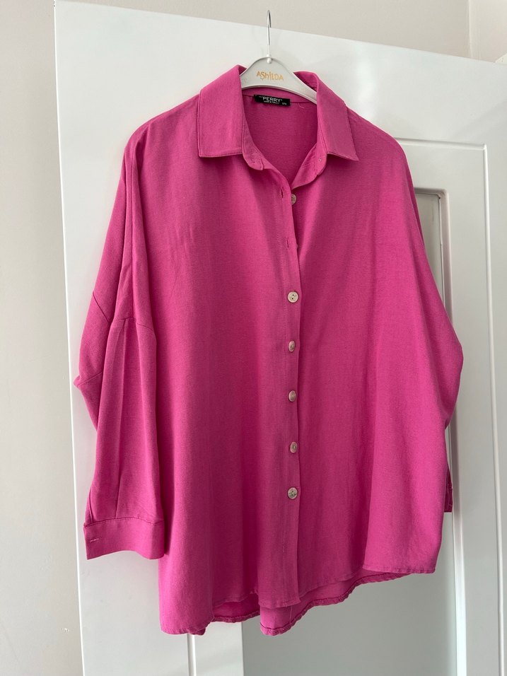 Pembe keten, düğmeli, yakalı ve uzun kollu bol kesim gömlek. Normal midi boyunda, sade ve günlük kullanıma uygun tarzda.