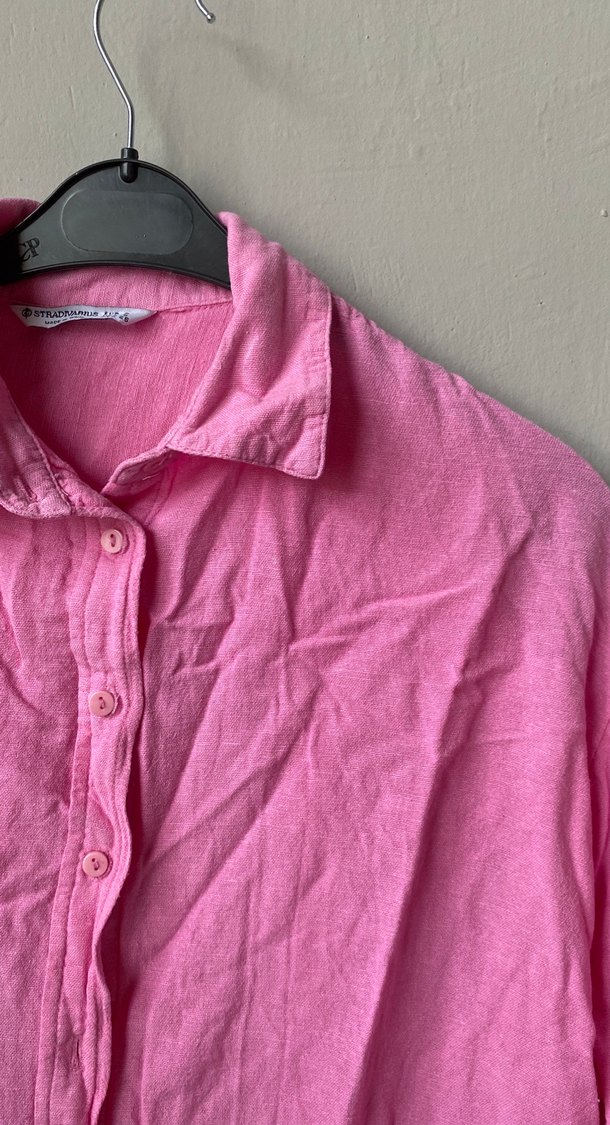 Pembe keten kumaştan, düğmeli ve uzun kollu, yakalı, bol kesim kadın gömleği. Pastel tonlarda, desensiz ve sade tasarıma sahiptir. Fotoğrafta görüldüğü üzere bir tane düğmesi eksik.
