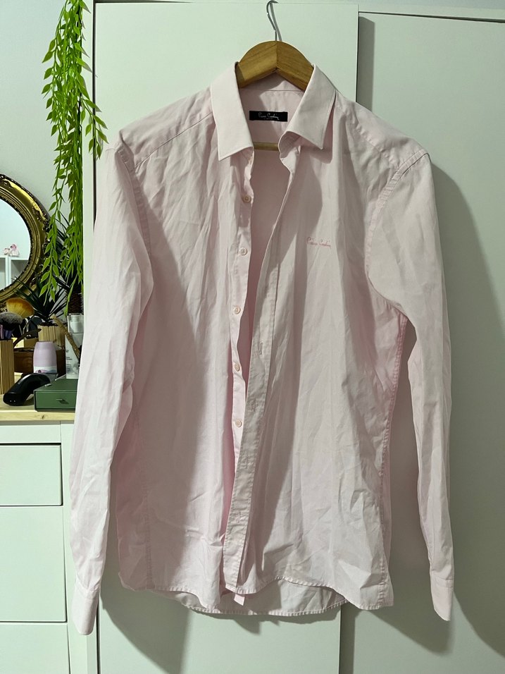 Pastel pembe renkte, keten kumaştan yapılmış, düğmeli ve uzun kollu erkek gömleği. Ofis için uygun, minimalist ve normcore tarzda, regular fit.