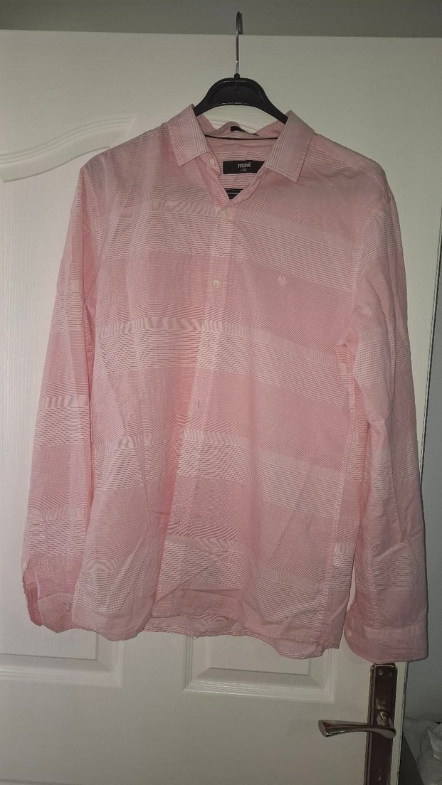 Uzun kollu, yakalı ve salaş kesimli erkek gömlek. Yumuşak keten kumaştan yapılmış, düğmeli ve pastel pembe renktedir. Günlük sokak stili için uygundur.
