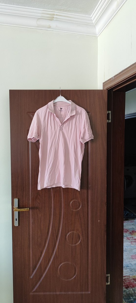 Pembe keten erkek polo tişört, kısa kollu ve yakalıdır. Gevşek kesimi ve sade tasarımıyla günlük kullanıma uygundur.