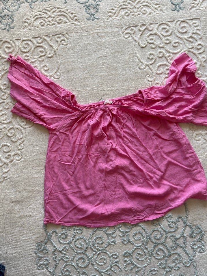 Pembe keten kumaştan, kısa kollu ve kayık yaka, fırfır detaylı bol kesim bohem bluz. Günlük kullanıma uygun.