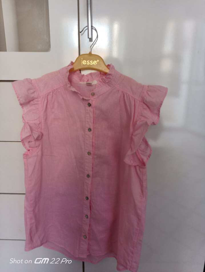 Pembe keten kumaştan, kısa fırfırlı kollu, V yakalı, salaş kesim kadın gömlek. bir defa kullanıldı beden olmadığından satıyorum