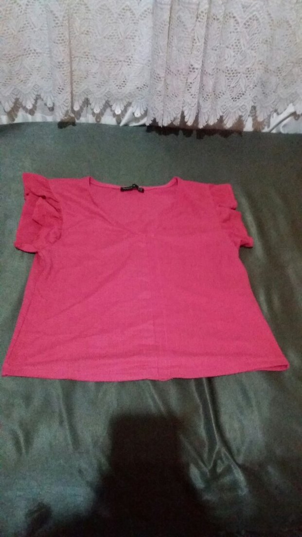 Koyu pembe renkli, keten kumaştan, kısa kollu, V yakalı, fırfırlı detaylı, bol kesim tişörtü. Sokak stiline uygun sade tasarım.