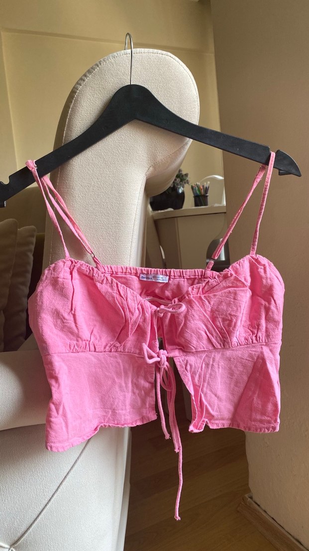 Pembe keten kumaştan yapılmış, ince askılı ve düğmeli ön detaylı, kısa kesim bohem tarzı büstiyer.