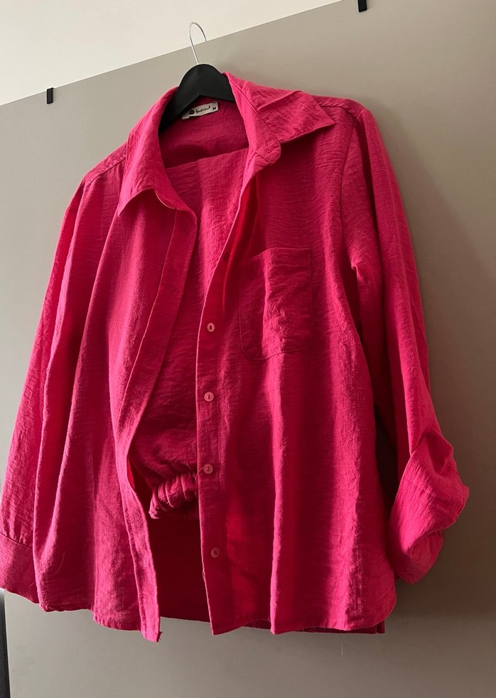 Yumuşak keten kumaştan, fuşya renkte, düğmeli, salaş kesim, uzun kollu kadın gömlek ve palazzo pantolon.