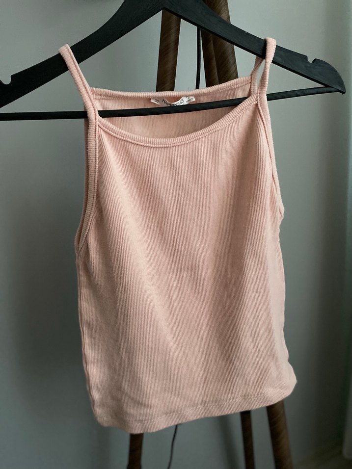 Pembe keten kumaştan, yüksek yakalı ve askılı, sade ve şık kesime sahip kadın bluz.