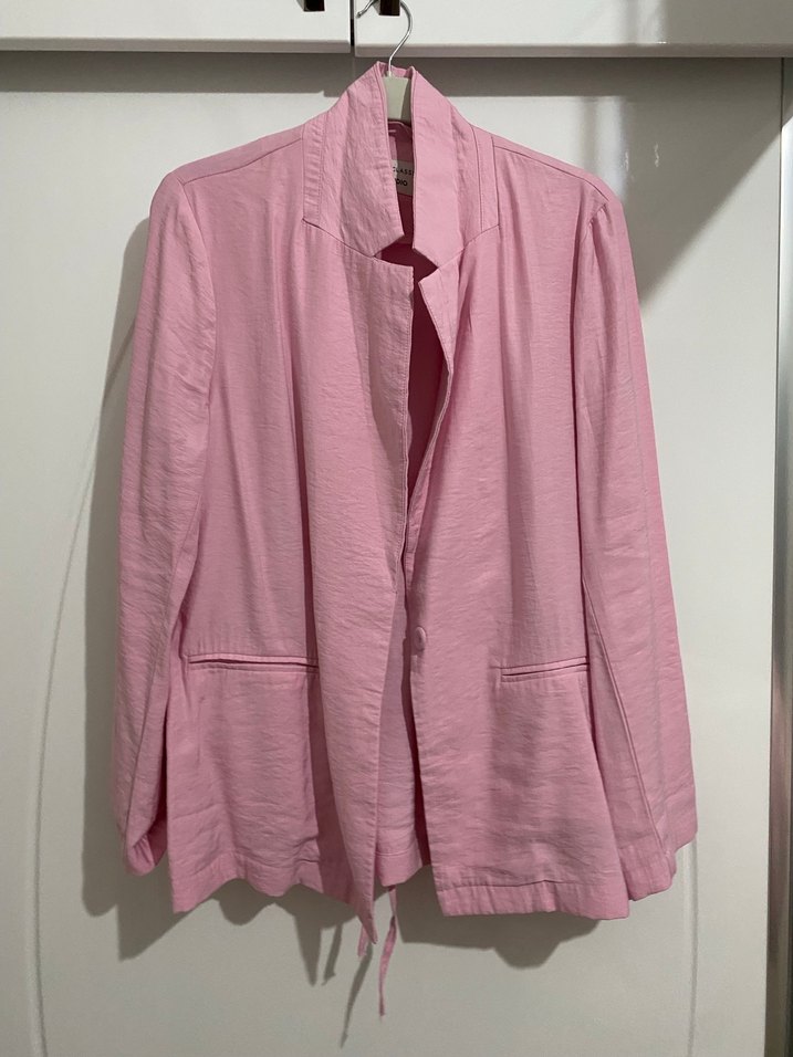 Pembe keten kumaştan yapılmış, düğmeli ve kesik yakalı kadın blazer ceket. Uzun kollu, normal kesim ve midi boyda, ofis kullanımı için uygun minimal bir tasarım.