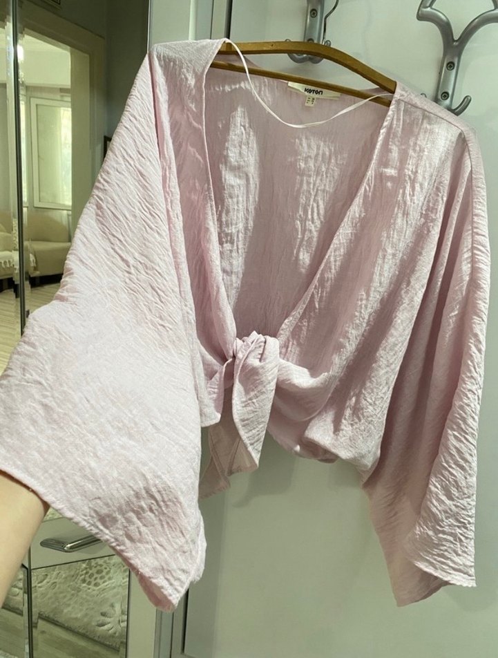 Pastel pembe renkte, yumuşak keten kumaştan drapeli tasarıma sahip kadın wrap bluz. Bohem ve Paris tarzı, trend günlük kullanım için uygun.