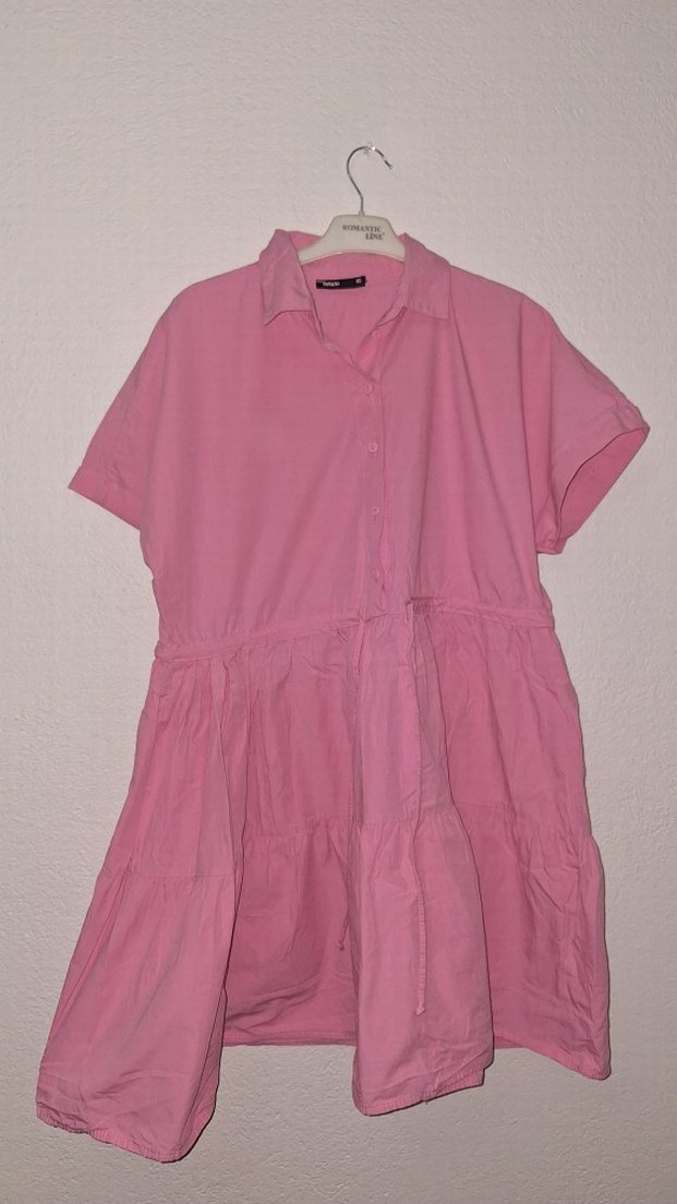 Pembe keten kumaştan, kısa kollu, yakalı ve fırfırlı detaylı kadın elbisesi. Rahat ve günlük kullanım için uygundur.