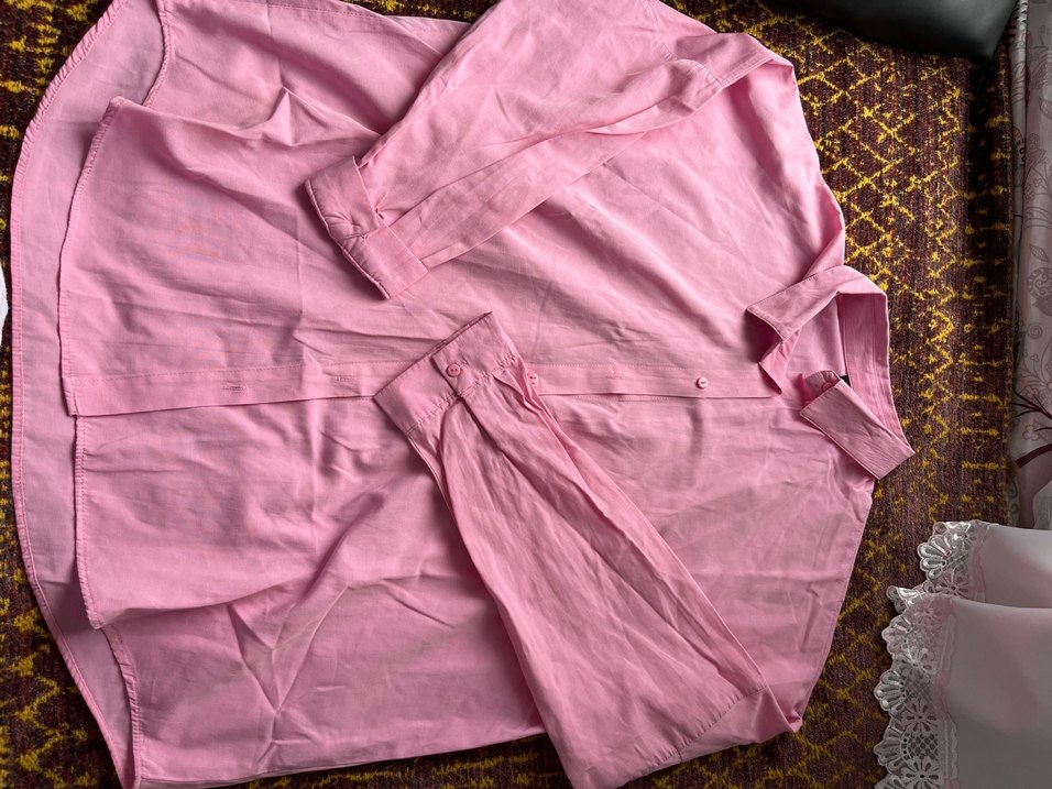 Pembe keten kadın gömlek, düğmeli, uzun kollu ve yakalıdır. Salaş kesimi ve sade deseniyle günlük kullanıma uygundur.