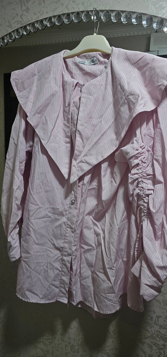 Pembe keten kumaştan, uzun kollu ve fırfırlı yakalı kadın gömleği. Salaş kesimi ve uzun boyu ile günlük kullanım için uygundur.