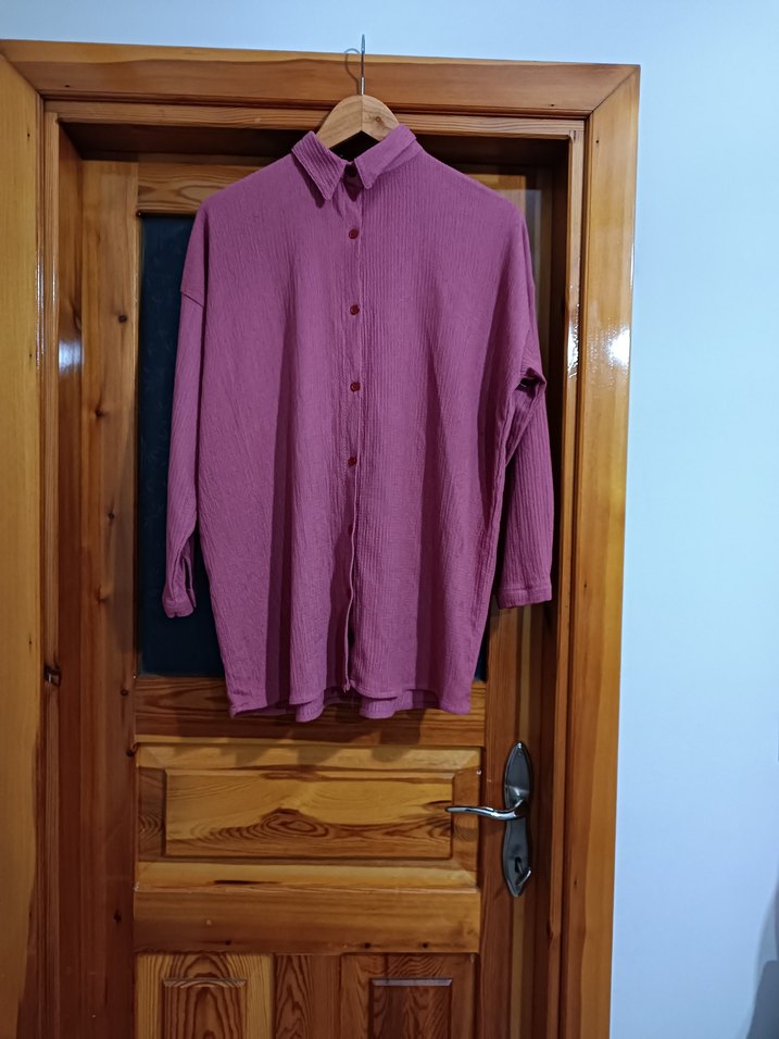 pembe keten kumaştan yapılmış, uzun kollu ve düğmeli kadın gömleği. Rahat kesimi ve yakalı tasarımıyla günlük kullanıma uygundur.