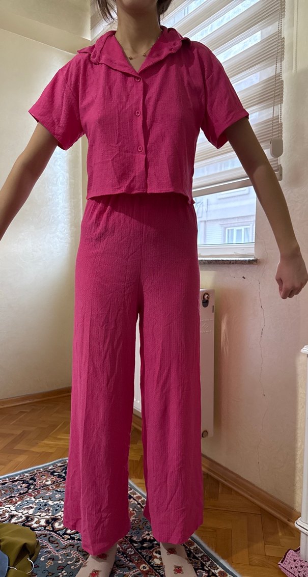 Pembe keten kumaştan, düğmeli, kısa kollu, yakalı ve midi boyda rahat kesim kadın tulumu. Günlük kullanıma uygun casual tarzda.