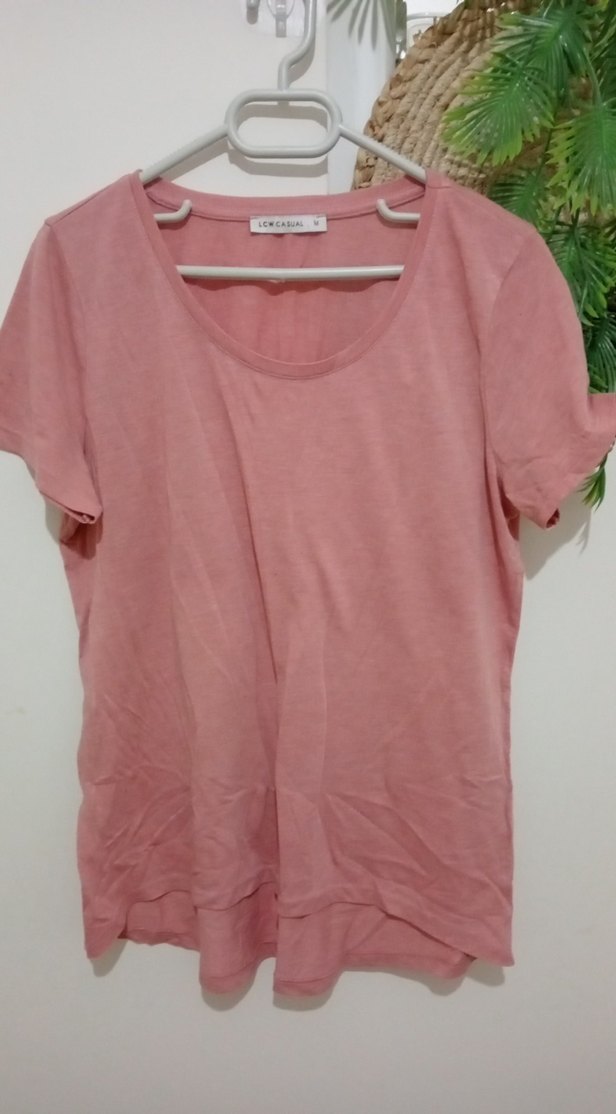 Pembe keten kumaştan, kısa kollu, salaş kesim ve yuvarlak yakalı kadın tişörtü, minimalist günlük şıklık için uygun.