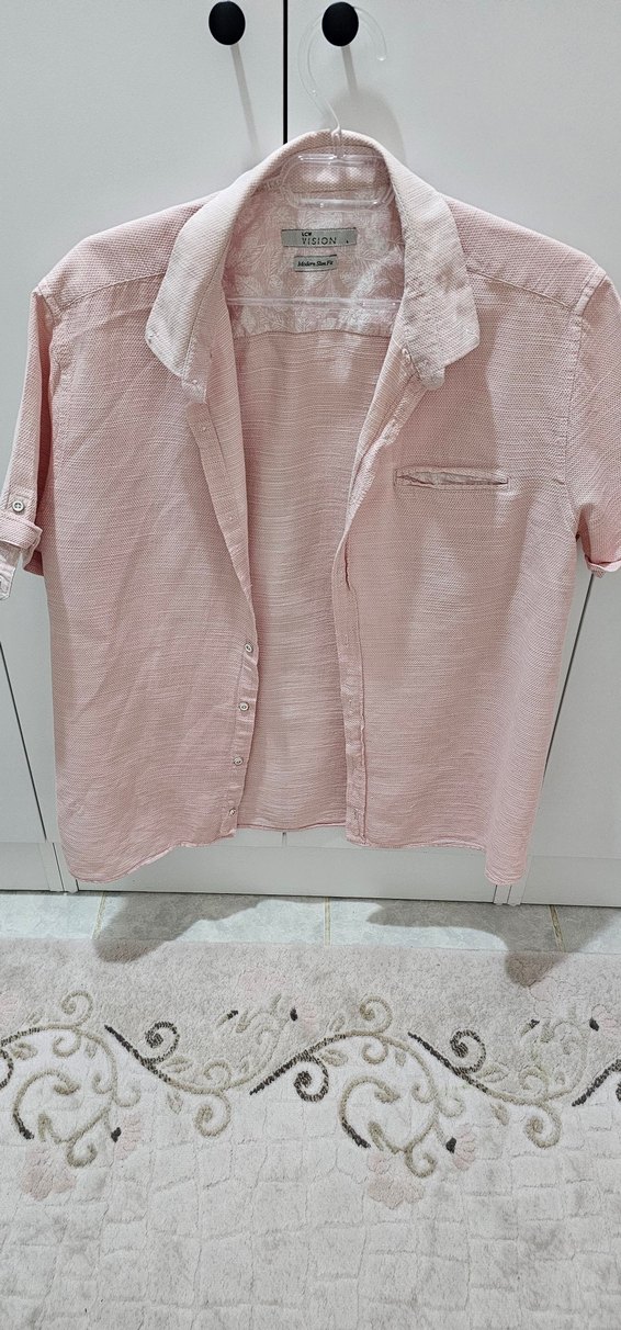 Pastel pembe renkte, keten kumaştan yapılmış, kısa kollu, düğmeli ve normal midi boyda erkek gömleği. Notched lapel yakaya sahip, rahat kesim ve gündelik sokak stili için uygun.