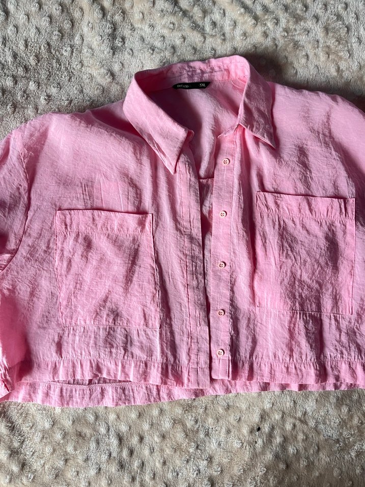 Pembe keten kumaştan, kısa kollu ve yakalı, düğmeli, bol kesim gömlek. Önünde iki cep bulunur. Günlük kullanıma uygundur.