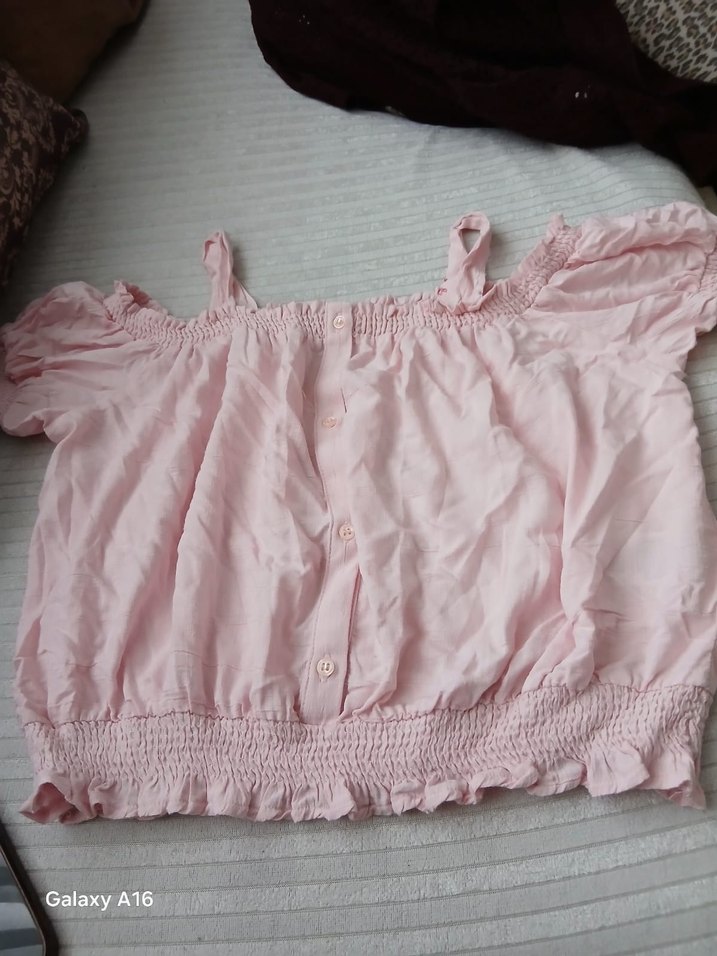 Pastel pembe keten kumaştan, fırfırlı ve askılı kollu, salaş kesim kız bluzu. Omuzları açık, desensiz ve sade tasarımlı.