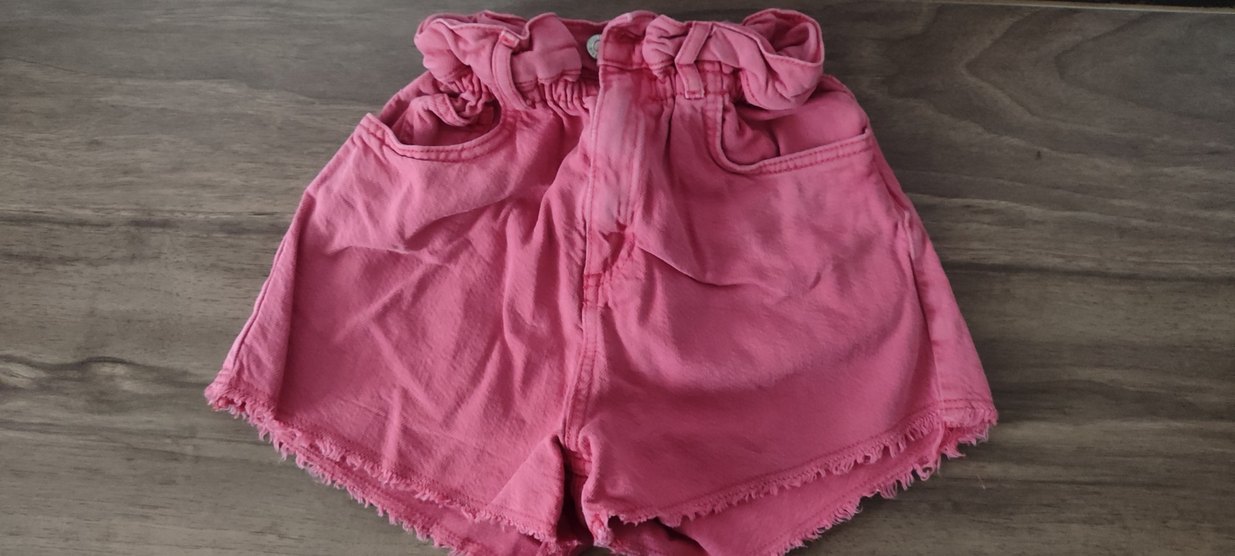 Pembe keten kız şortu, bol kesim ve fırfır detaylarıyla moda sokak tarzına uygun.