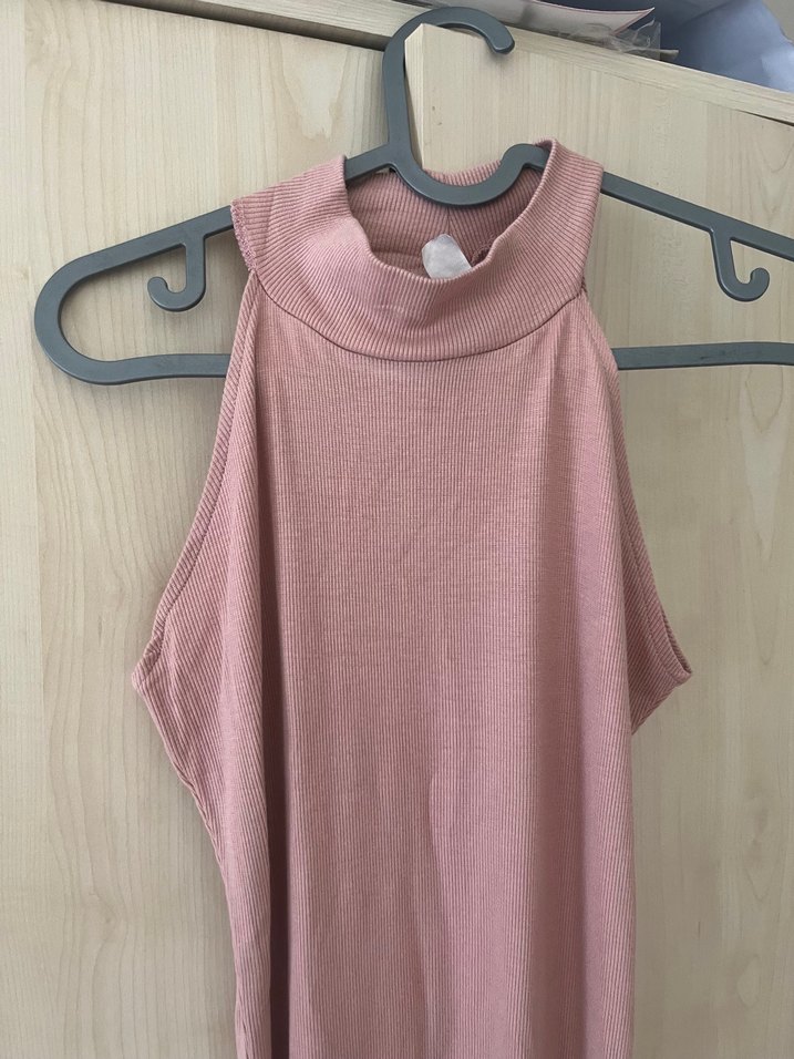 Pembe keten kumaştan, yüksek yakalı ve drapeli, kolsuz uzun elbise. Minimalist ve desensiz tasarımıyla günlük kullanıma uygun.