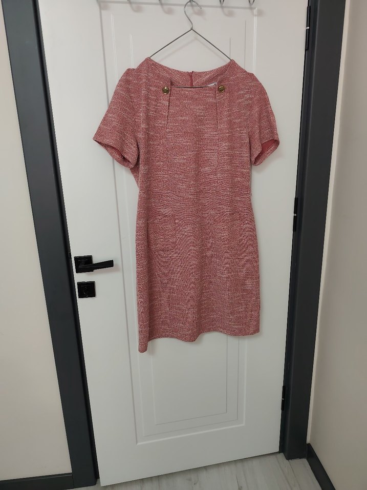 Pembe keten midi elbise, kısa kollu ve yuvarlak yaka. Düğme detayı bulunur, rahat kesim ve minimalist tasarım, günlük kullanıma uygundur.