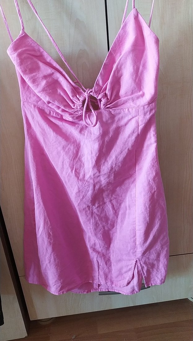 Pembe keten kumaştan, drapeli ve V yakalı, kolyessiz, midi uzunlukta, bohem tarzda günlük elbise.