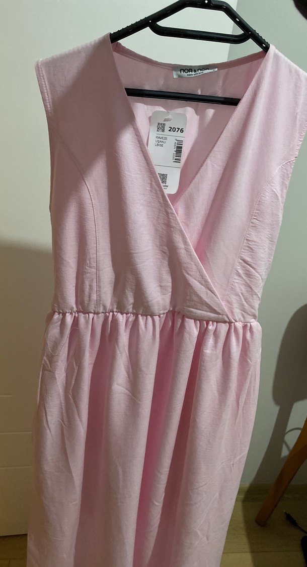 Pastel pembe keten kumaştan, V yakalı ve pile detaylı, bol kesim midi elbise. Günlük kullanım için rahat ve şık.