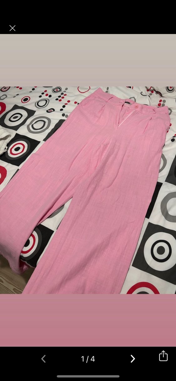 Pembe keten kumaştan kadın pantolonu. Günlük kullanıma uygun sade ve rahat tarzda. Uygun iç çamaşırı ile giyilmeli. L beden.