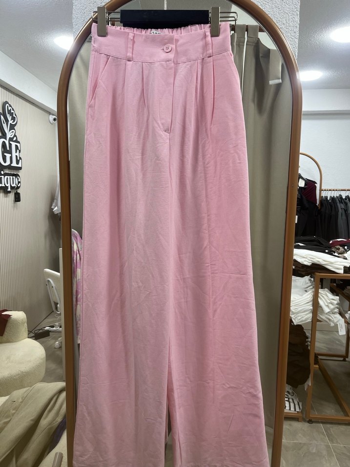 Yumuşak keten kumaştan, uzun ve bol kesim pembe kadın pantolon. Pilili detaylarıyla rahat normcore tarzını yansıtır, günlük kullanıma uygundur.