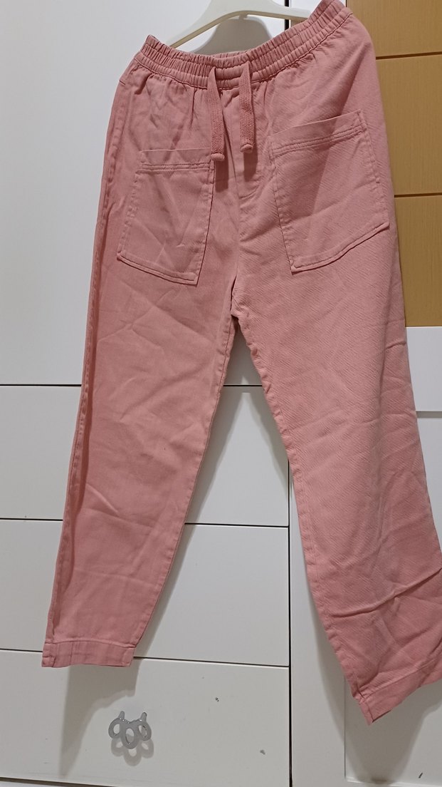 Ön cepli, midi boy, pembe keten rahat kesim kadın pantolon, gündelik kullanıma uygun zahmetsiz şıklık sunar.