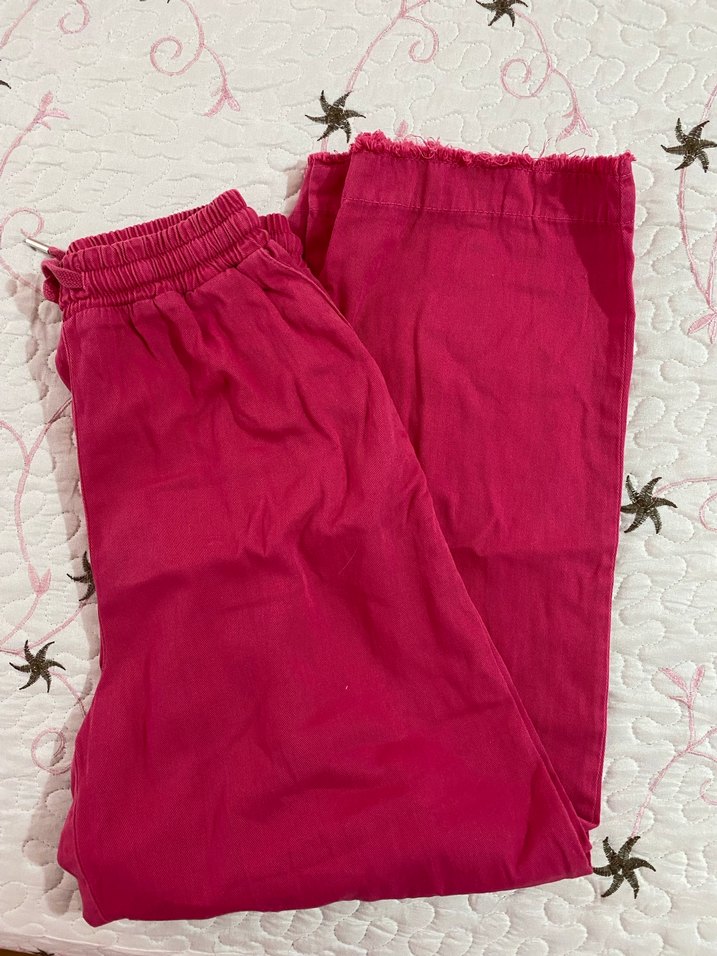 Pembe keten, parlak görünümlü, salaş kesim kadın pantolon, günlük rahatlık ve şıklık sunar.