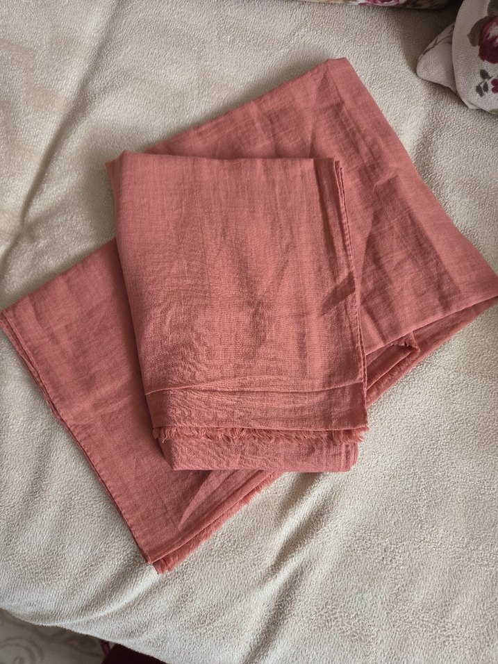 Pembe keten kumaştan, salaş ve drapeli tasarıma sahip, rahat ve bohem tarzda kadın şalı. Sade ve temel bir modeldir.