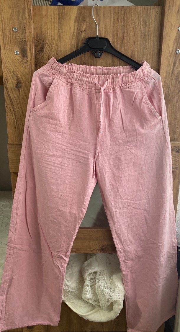 Pembe keten kumaştan, salaş kesim, midi boy kadın pantolon. Lastikli bel ve cepleriyle gündelik rahat ve şık bir tarz sunar.