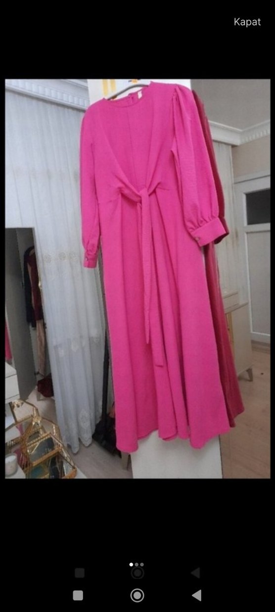 Pembe keten kumaştan, salaş kesim ve V yakalı uzun elbise. Drapeli detaylar ve ince askılı bohem tarzda, günlük kullanıma uygun.