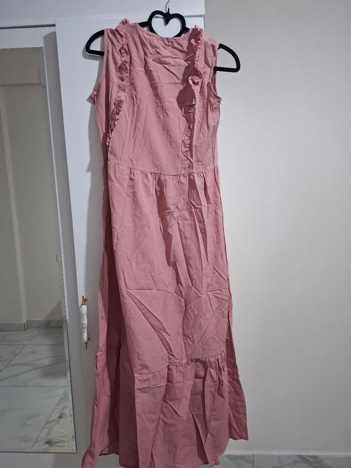 Pembe keten kumaştan, salaş kesimli, uzun ve kolsuz elbise. V yaka ve fırfır detaylarıyla bohem tarzda, günlük kullanıma uygun. tesettür giyim