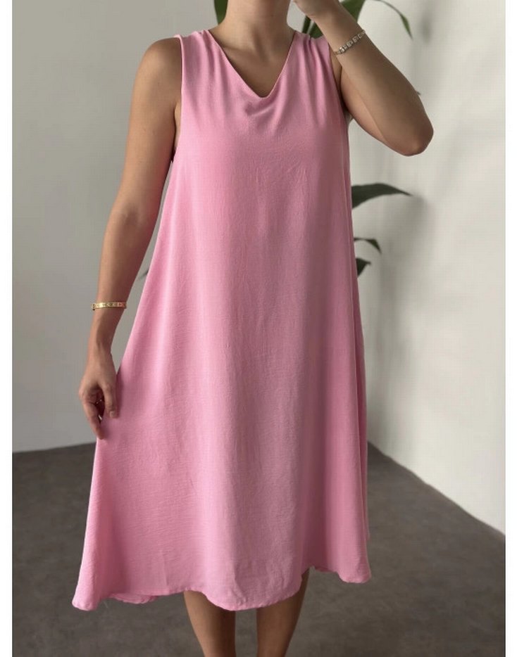 Pembe keten kumaştan, salaş kesim ve V yakalı, kolsuz uzun elbise. Günlük kullanıma uygun, drapeli ve pastel tonlarda sade tasarım.