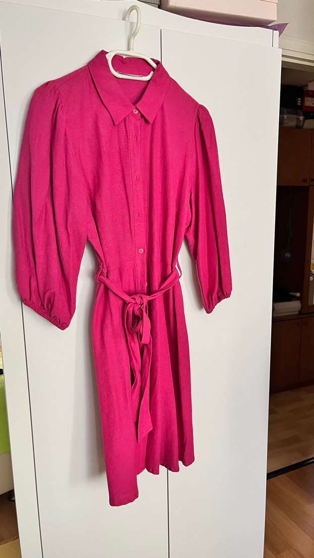Pembe renkte, keten kumaştan uzun ve bol kesim elbise, yakalı ve askılı kollu, kemer detayıyla tamamlanmıştır. Ofis için bohem tarzda şık bir seçim.