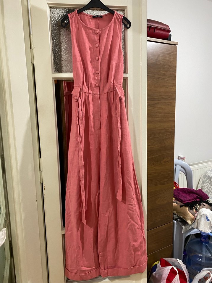 Pembe keten kumaştan, düğmeli ve yakası kesimli, salaş kesim uzun tulum.Bir sorunu yok yenidir