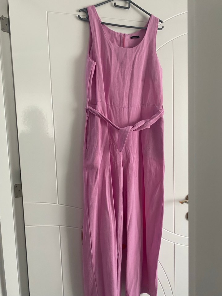 Pembe keten uzun tulum, drapeli ve V yakalıdır. Kolsuz ve regular fit kesimiyle minimal ve normcore tarzda, günlük kullanıma uygundur.