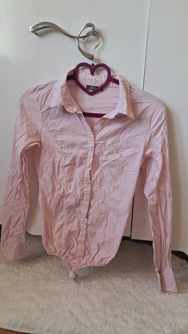 Pembe keten kumaştan, uzun kollu, düğmeli, yakalı ve normal uzunlukta, trend sokak stili için uygun, şık bir gömlek.