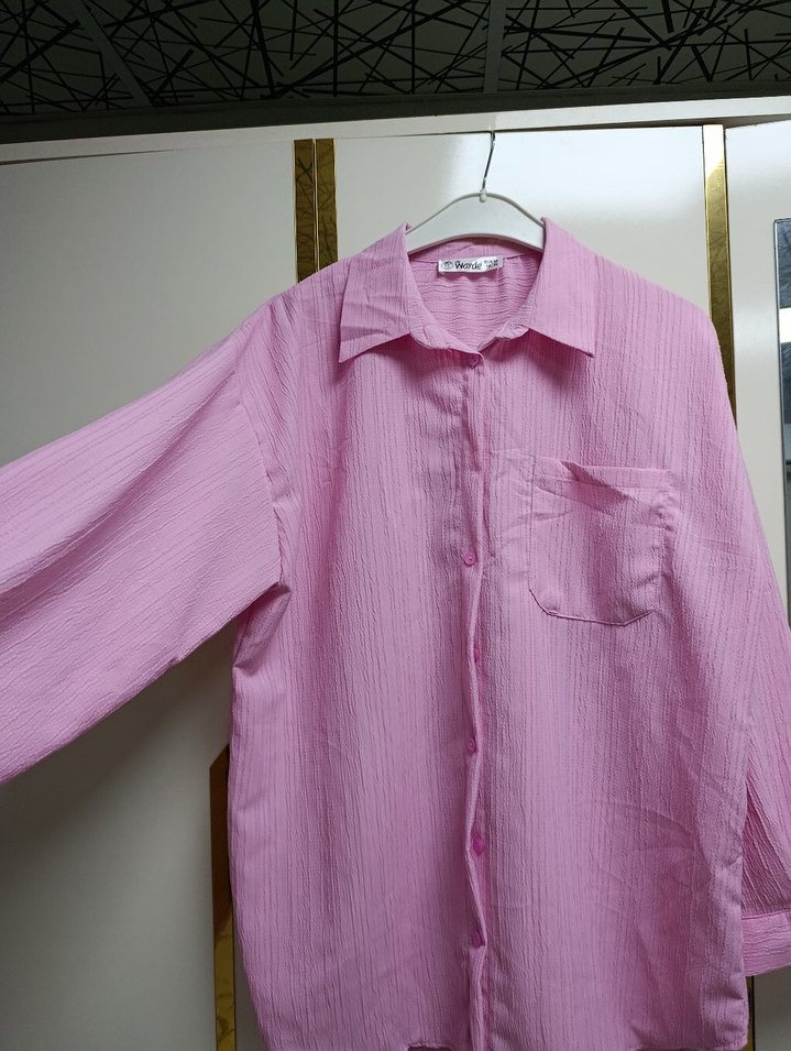 Pembe keten kumaştan, uzun kollu ve düğmeli, yakalı, cep detaylı bol kesim gömlek. Günlük kullanım için uygundur. L ve XL bedene uygundur. atölyeden yeni çıktı hiç giyilmedi ve hiç defosu yoktur.